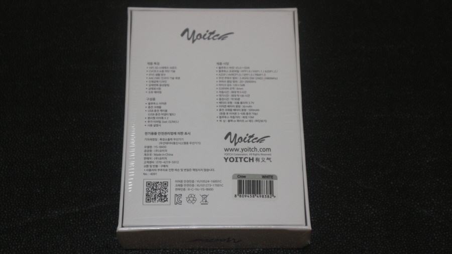 요이치 크로우 블루투스 5.0 무선 이어폰 박스 후면 사진입니다.