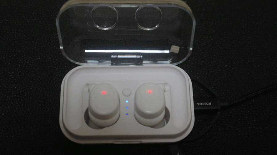 중간 버튼을 사용해서 케이스 충전 량을 확인할 수 있고, 이어폰이 완충되면 레드에서 블루로 변경 후 점등됩니다.