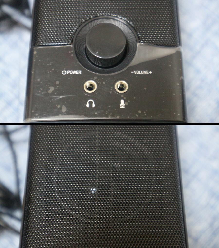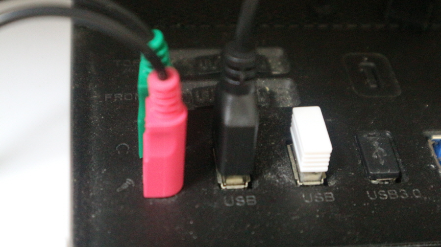 아래쪽에 전원 및 볼륨 조절기가 있고, 헤드폰, 마이크 단자가 별도로 있어 헤드셋을 연결할 수 있습니다.