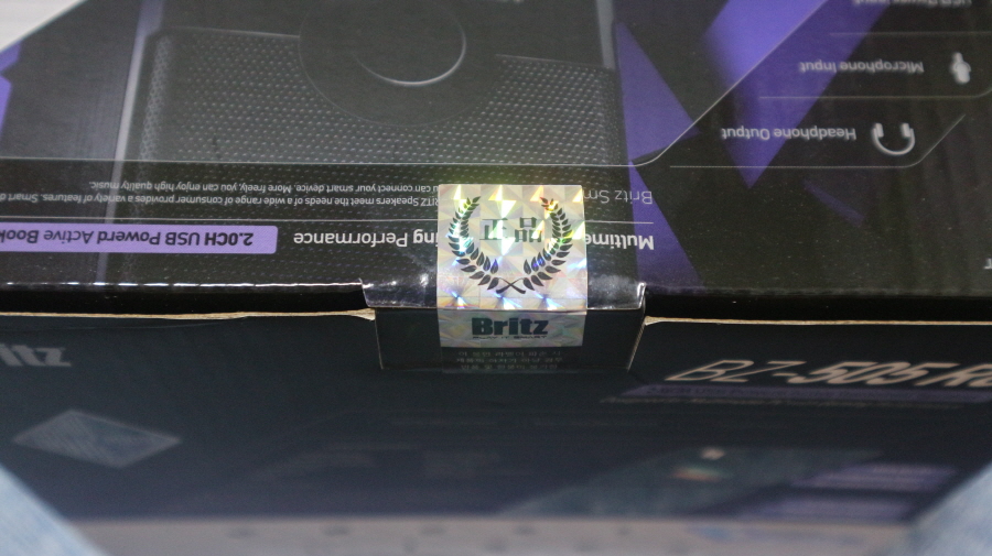 브리츠 BZ-505 Roll 2채널 게이밍 LED스피커는 박스 상단에 정품 로고가 인쇄된 밀봉씰이 있습니다.