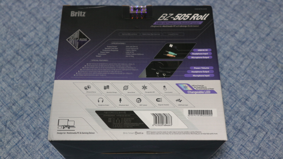 브리츠 BZ-505 Roll 2채널 게이밍 LED스피커 박스 후면 사진입니다.