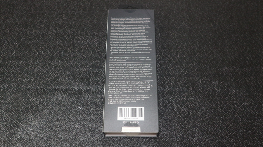 케이안 애플 MFi 인증 C to 라이트닝 케이블 박스 후면 사진입니다.