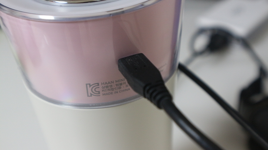 한경희 미니 텀블러 가습기 HTM-350C에 마이크로 5핀 충전 케이블을 연결했습니다.