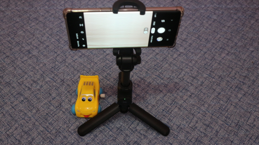 EV-BS01 삼각대 블루투스 셀카봉에 스마트폰을 거치했습니다.