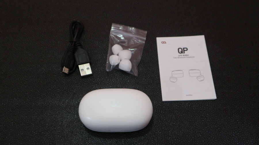 오아 큐피B2 블루투스이어폰 구성품은 본체, 이어 팁, 설명서, 충전 케이블로 되어 있습니다.