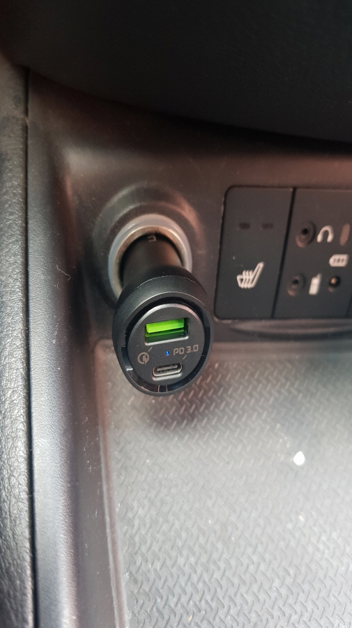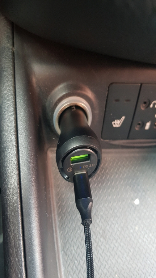 슈피겐 스터디부스트 USB PD 차량용 고속충전기 F31QC를 사용해서 PD 충전 케이블을 연결했습니다.