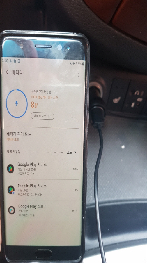 슈피겐 스터디부스트 USB PD 차량용 고속충전기 F31QC를 스마트폰에 연결하면 고속 충전이 표시됩니다.