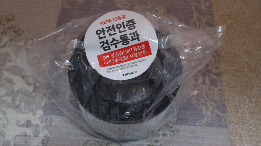 ThinkAir A3C 3평형 공기청정기 필터 포장에 헤파 13등급 안전 인증 검수 통과 스티커를 확인할 수 있습니다.