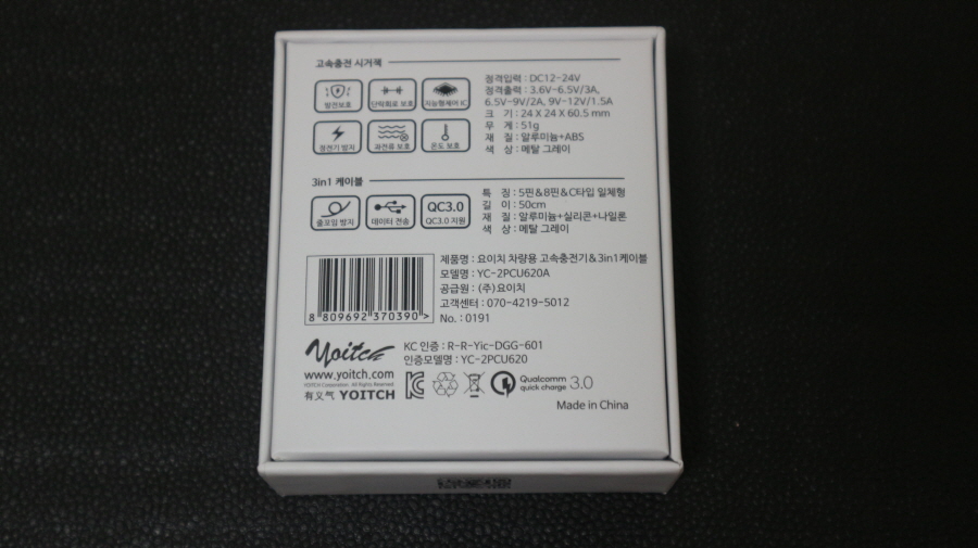요이치 비숍 차량용 시거잭 + 알파 3in1 고속 멀티 충전케이블 박스 후면 사진입니다.
