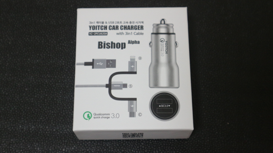 요이치 비숍 차량용 시거잭 + 알파 3in1 고속 멀티 충전케이블 박스 전면 사진입니다.