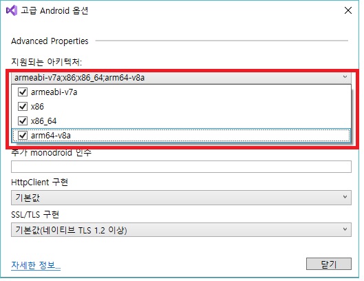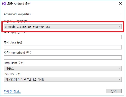 최상단에 있는 "지원되는 아키텍쳐" 콤보 박스를 클릭해주세요.