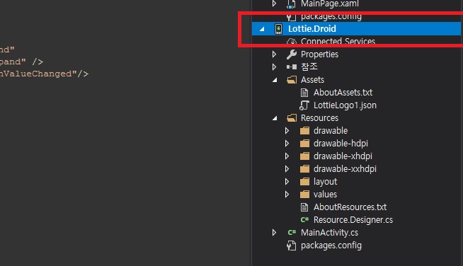 자마린을 사용해서 애니메이션 화면을 만들기 위해서 MainPage.xml에 Lottie 사용 시 갑자기