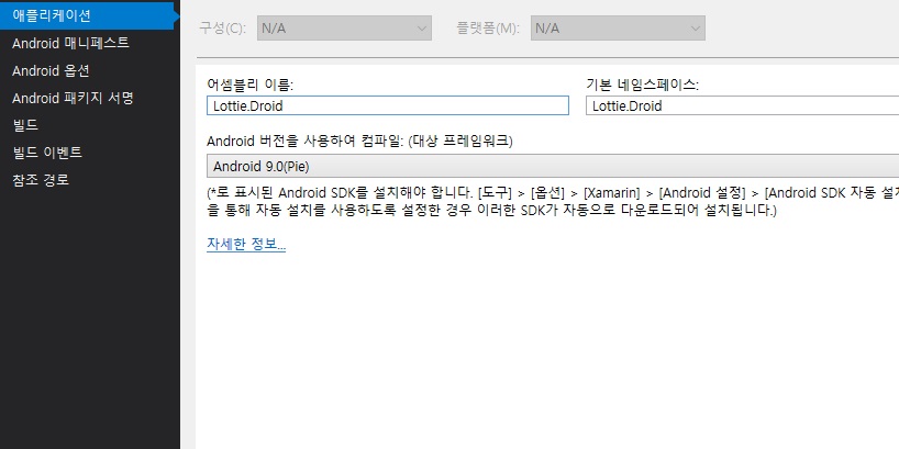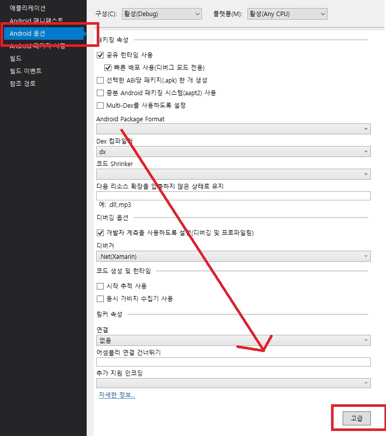 자마린(Xamarin) ABI 오류를 해결하기 위해서 "android 옵션" 메뉴를 선택하고