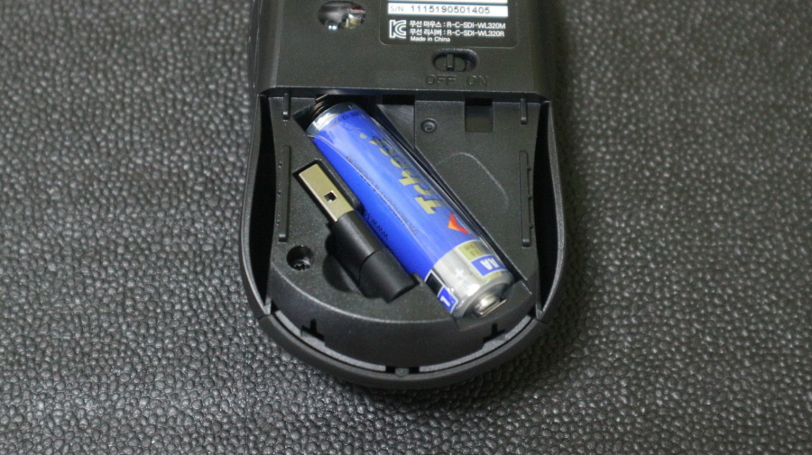 무소음 듀얼지원 스카이디지탈 WL3 무선 마우스 하단 아래쪽을 오픈하면 리시버와 건전지를 확인할 수 있습니다.