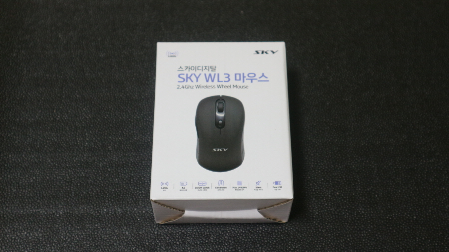 무소음 듀얼지원 스카이디지탈 WL3 무선 마우스 박스 전면 사진입니다.