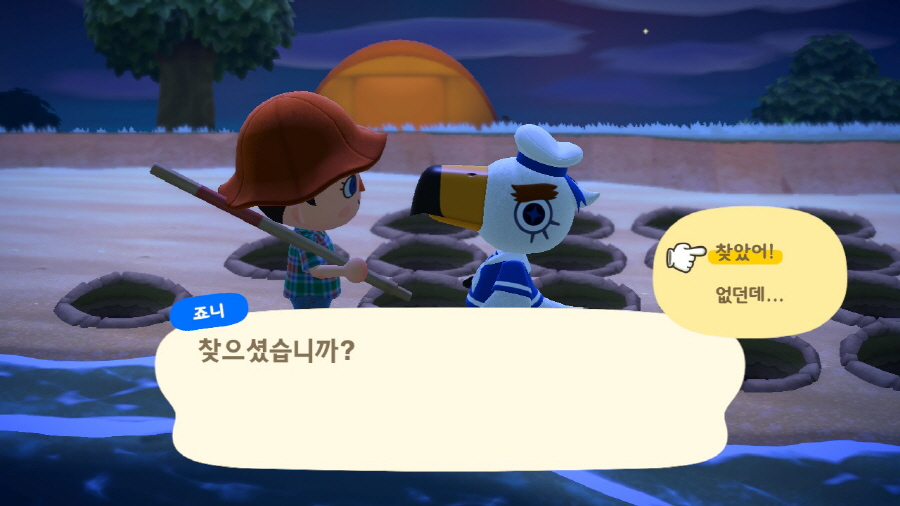 모여봐요 동물의 숲 죠니가 알려준 힌트 해변가를 무장적 삽으로 파보면 통신 장치를 찾을 수가 없습니다.