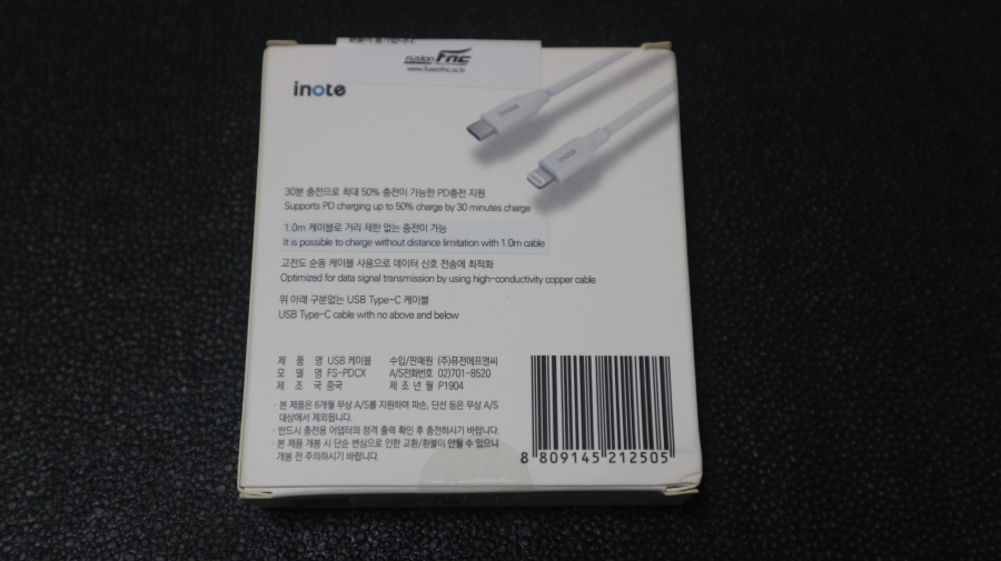 아이노트 FS-PDCX 애플 MFI 공식인증 C TO 라이트닝 고속 충전 케이블 박스 측면 사진입니다.