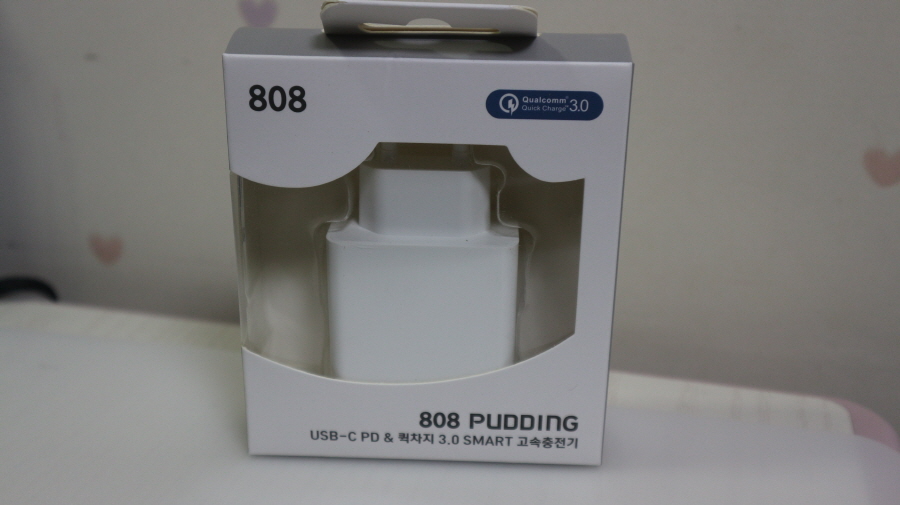 808 2세대 USB 2IN1 고속 PD 충전기 PUDDING 박스 전면 사진입니다.