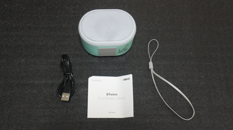러블리한 미니 앱코 비토닉 BTwins 블루투스스피커 구성품은 본체, 사용 설명서, 충전 케이블, 스트랩으로 되어 있습니다.