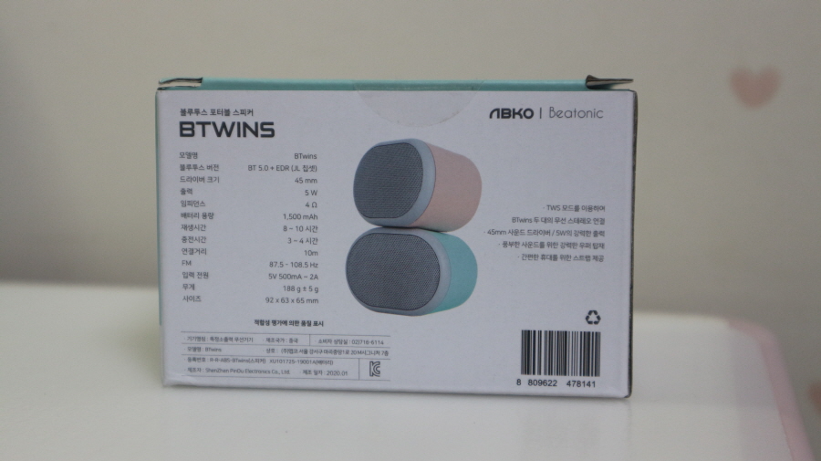 러블리한 미니 앱코 비토닉 BTwins 블루투스스피커 박스 후면 사진입니다.