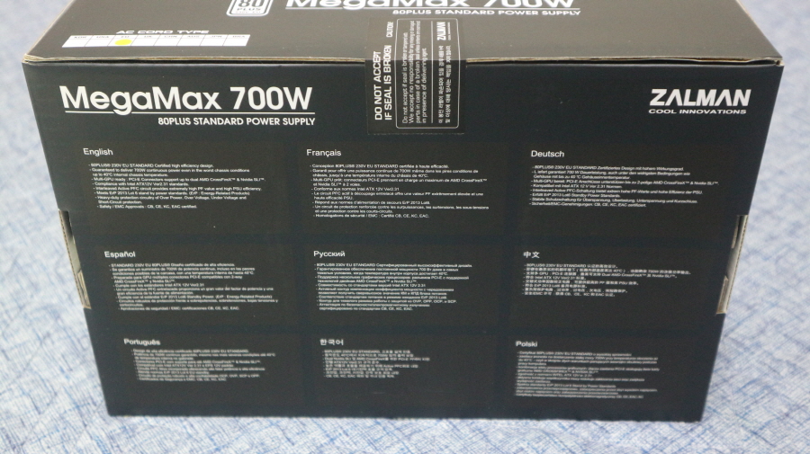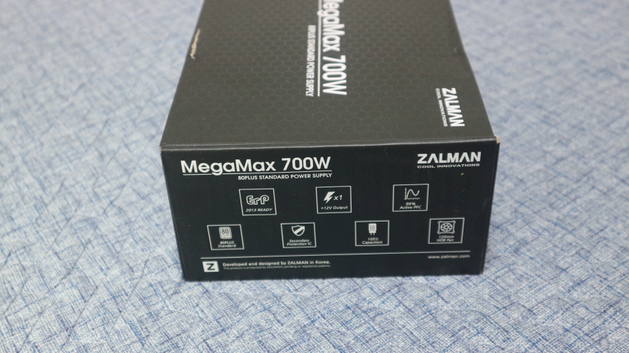 잘만 MegaMax 700W 80PLUS STANDARD 파워 박스 측면에는 제품 특징이 출력되어 있습니다.