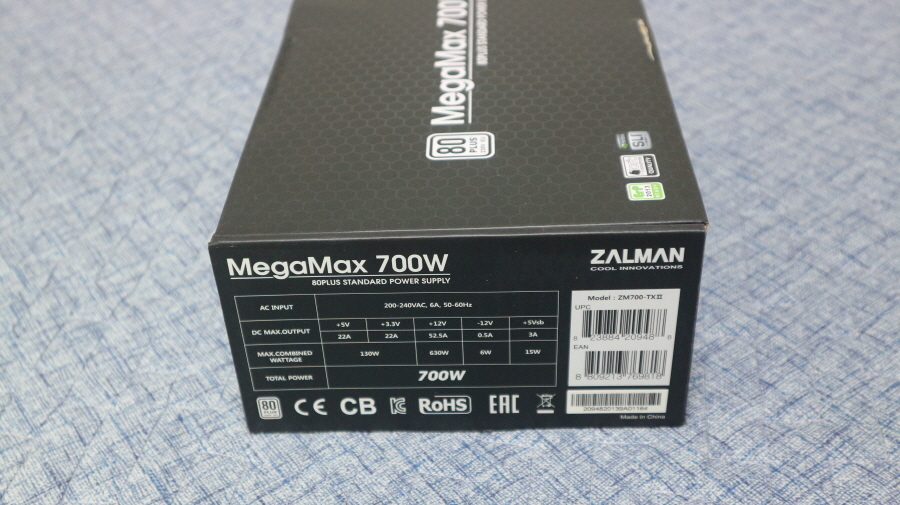 잘만 MegaMax 700W 80PLUS STANDARD 파워 박스 다른 측면에는 제품 정보가 출력되어 있습니다.