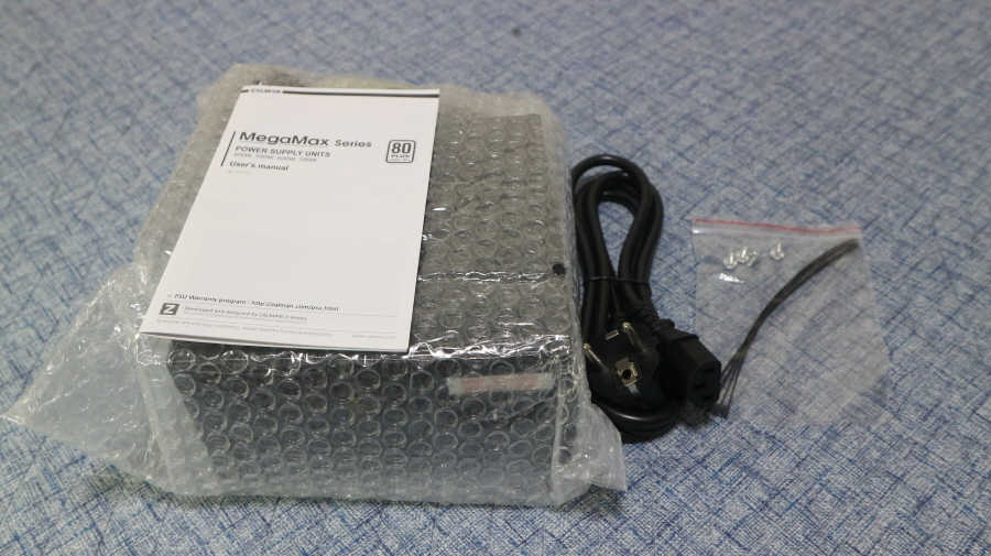 잘만 MegaMax 700W 80PLUS STANDARD 파워 구성품은 설명서, 본체, 케이블 타이, 전원 코드, 고정 나사로 되어 있습니다.