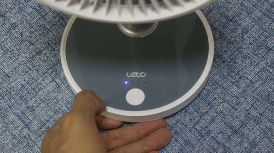 레토 휴대용 무선 선풍기 LMF-PS01은 하단 버튼을 3초간 눌러주면 아래쪽 무드 등이 점등됩니다.