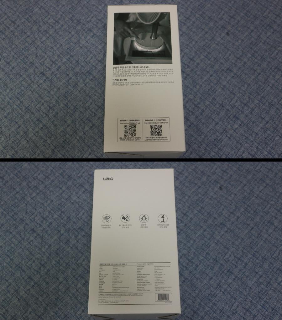 레토 휴대용 무선 선풍기 LMF-PS01 박스 측면에는 제품 정보를 확인할 수 있습니다.