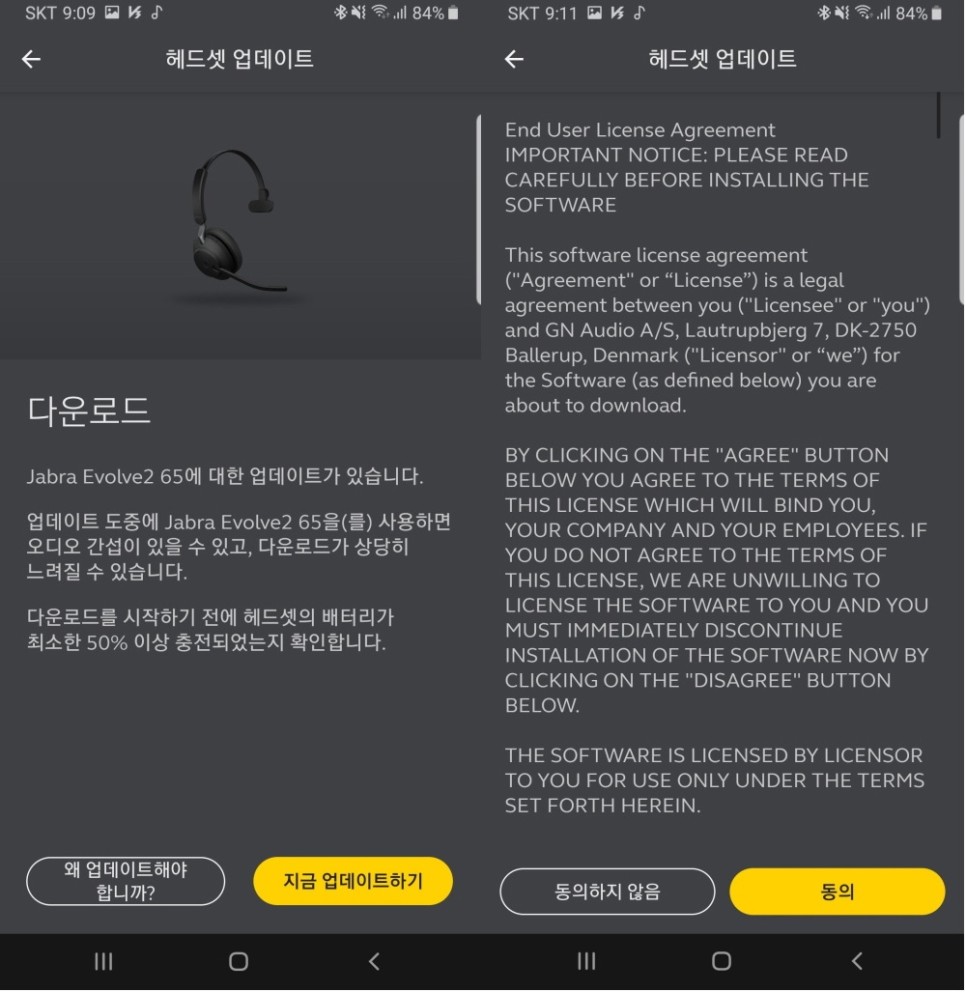 헤드셋 펌웨어 버전을 확인하고 업데이트 진행을 진행할 수 있습니다.