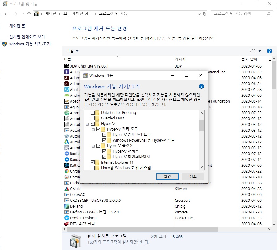 "프로그램 제거 또는 변경" 왼쪽에 있는 'Windows 기능 켜기/끄기'를 클릭하고 Hyper-V 항목을 모두 체크해 주세요.