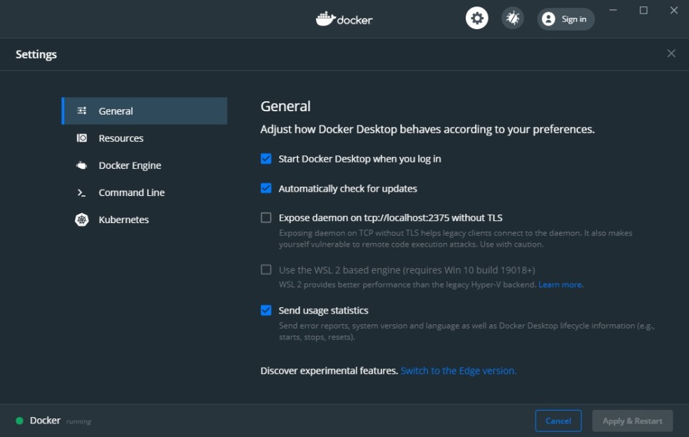 재부팅 후 정상적으로 docker(도커)가 windows에서 실행되는 걸 확인할 수 있습니다.