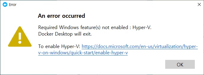 Hyper-V가 정상적으로 동작해야 Docker(도커)가 실행됩니다.
