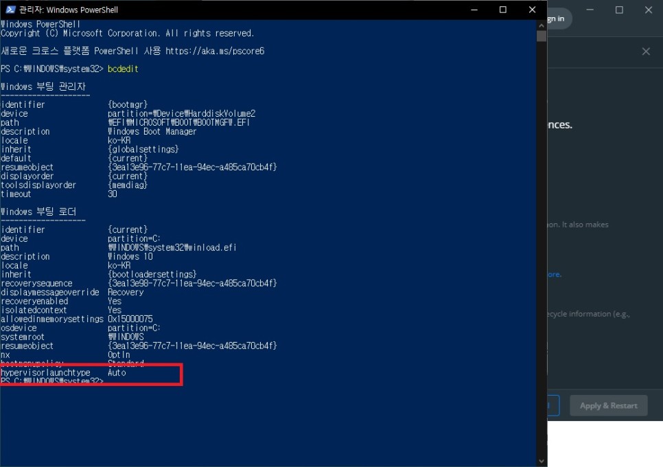 "bcdedit" 명령어를 실행하면 하단에 'hypervisorlaunchtype'이 off 되어 있는 상태입니다.