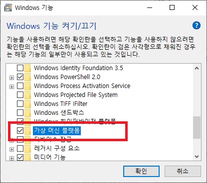 아래쪽에 있는 가상 머신 플랫폼도 체크해 주세요.