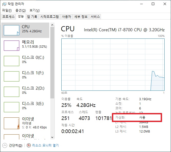 설치 전 먼저 작업관리자에서 가상화 활성화 여부를 확인해 주세요.