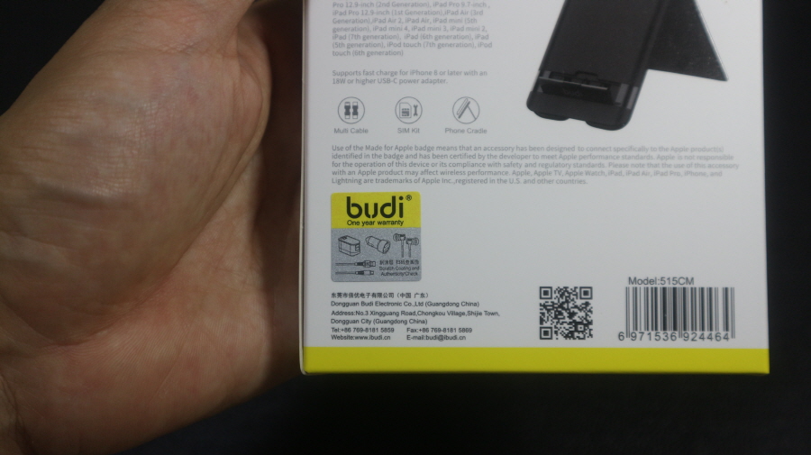 박스 후면에는 BUDI 정품 인증 스티커를 확인할 수 있습니다.
