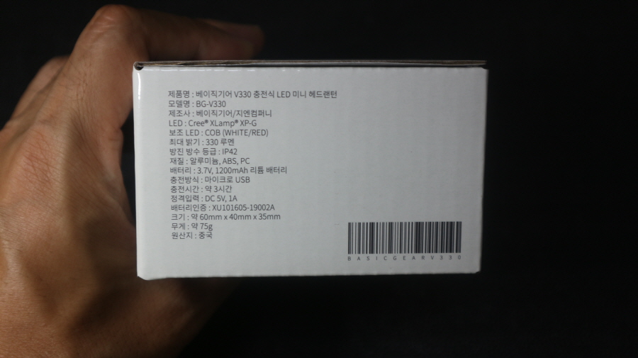 베이직기어 충전식 헤드랜턴 V330는 1200mAh 배터리가 내장되어 있습니다.