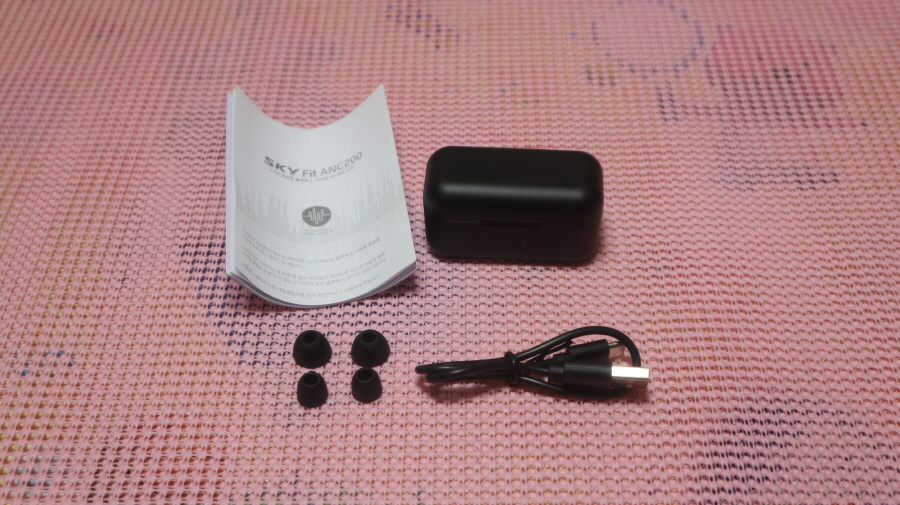구성품은 본체, 충전 케이블, 이어 팁, 설명서로 되어 있습니다.