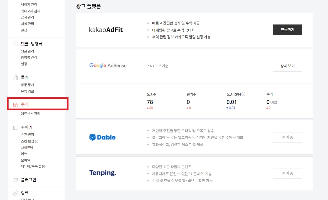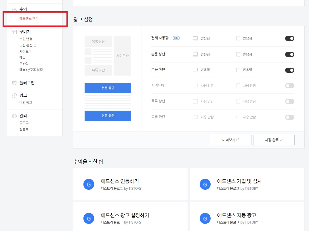 다시 메뉴를 확인하니까 수익 아래쪽에 "애드센스 관리" 메뉴를 클릭할 수 있습니다.