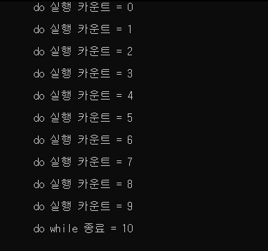 while문에서는 9까지만 출력되었는데 do while문에서는 10까지 한번 더 출력됩니다.