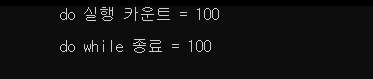 a 변수를 100으로 초기화 하면 while문에서는 거짓이지만 do문을 먼저 실행합니다.