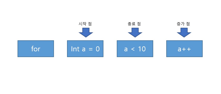for 문은 시작점, 종료점, 증가점 3개의 구문으로 구분됩니다.