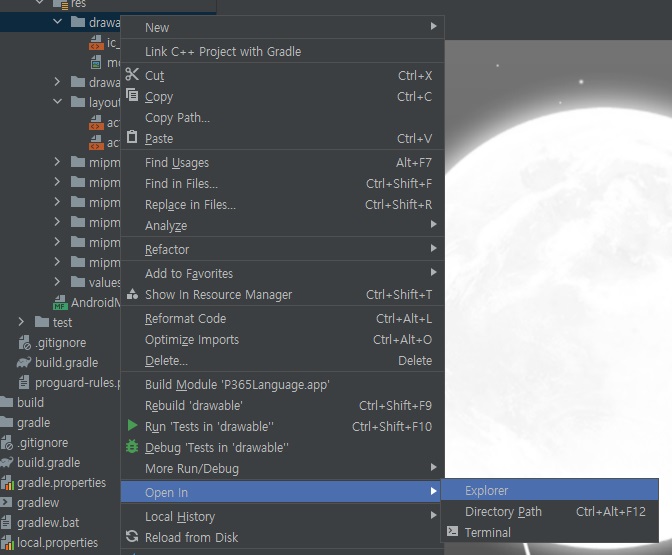 drawable 폴더에서 우클릭을 사용해서 Explorer을 오픈해서 이미지를 복사하면 자동으로 drawable 하위에 이미지가 등록됩니다.