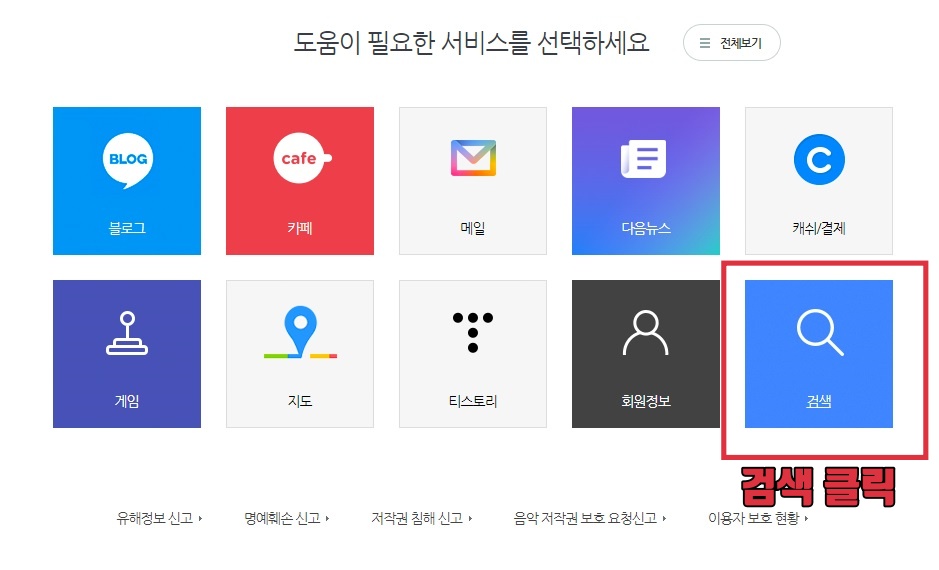 고객센터를 클릭하면 다양한 화면이 보이는데, 그중에서 검색을 클릭해주세요.