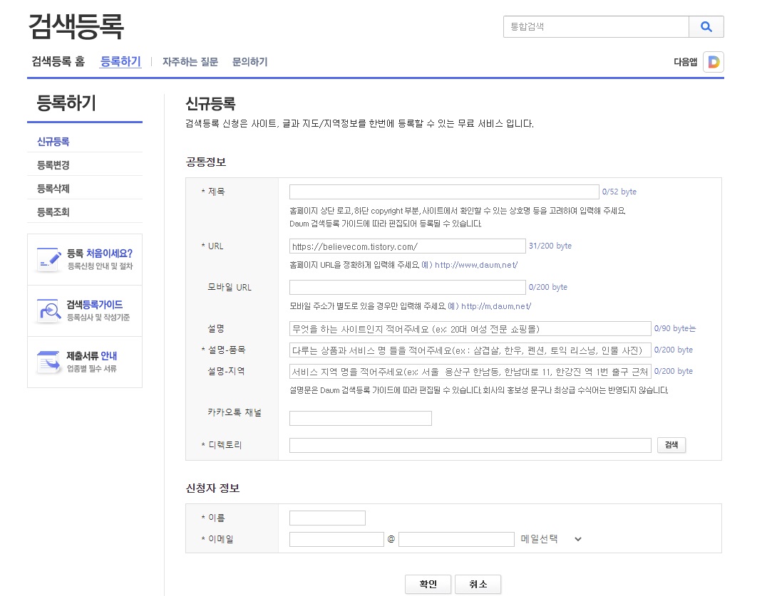 검색등록에 필요한 제목, URL, 설명, 설명, 품목, 신청자 정보를 입력하고 "확인" 버튼을 클릭해주세요.