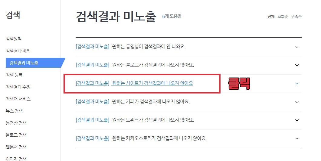 검색결과 미노출에서 세 번째 내용 "원하는 사이트가 검색 결과에 나오지 않아요"을 클릭해주세요.