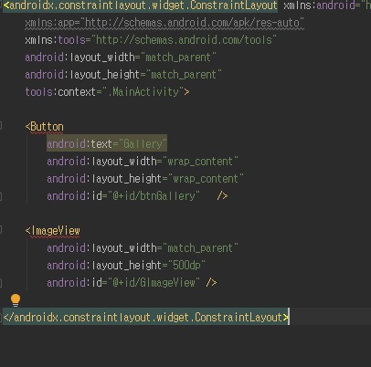 갤러리를 호출하기 위한 Button과 선택한 이미지를 출력하기 위한 ImageView를 선언합니다.