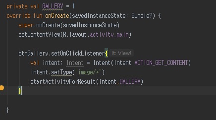 이제 MainActivity에서 버튼 이벤트를 생성해서 갤러리 호출 이벤트 연결이 필요합니다.