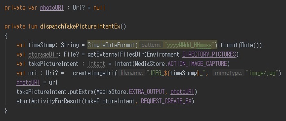 카메라를 동작하기 위해서 dispatchTakePictureIntentEx 함수를 추가합니다.